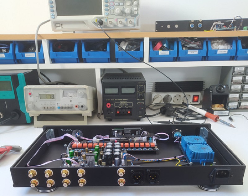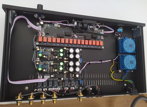 Preamplificador de línea transistorizado con sistema de control de volumen a relés con resistencia serie.